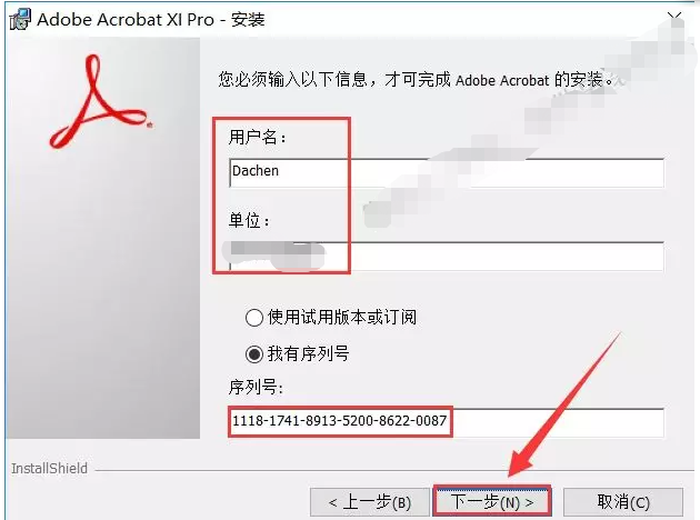 7.填写信息(用户名和单位可随意填写),输入序列号【1118-1741-8913-5200-8622-0087】,然后点击【下一步】。