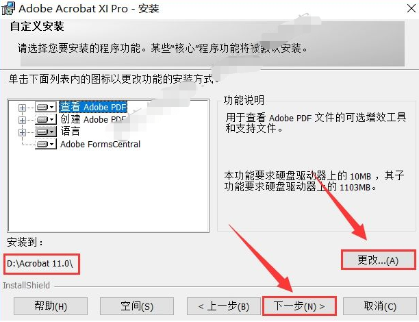 10.点击【更改】更改软件的安装目录,建议安装在除C盘之外的其它磁盘,可在D盘或者其它磁盘新建一个【Acrobat 11.0】文件夹,然后点击【下一步】。