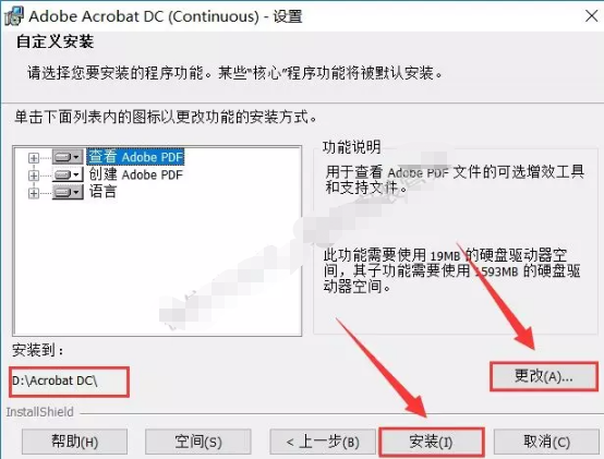 5.点击【更改】更改软件的安装目录,建议安装在除C盘之外的其它磁盘,可以在D盘或者其它磁盘新建一个【Acrobat DC】文件夹,然后点击【安装】。
