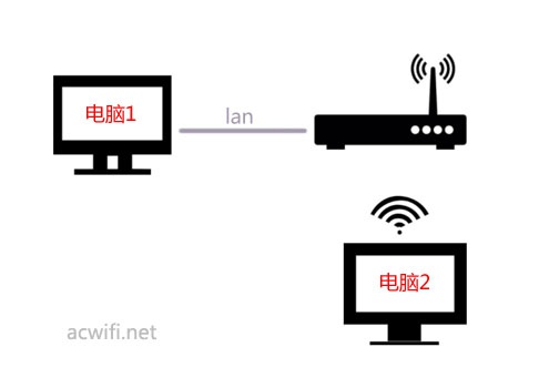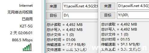 有别于上面的NAT测试,这是用lan to wlan的方式,即一台电脑连接斐讯K2T的LAN口,另一台电脑无线连接它的WIFI,用文件互相拷贝的方式,文件拷贝工具使用fastcopy。连接图: