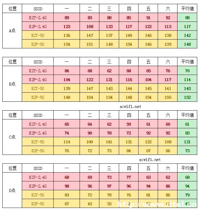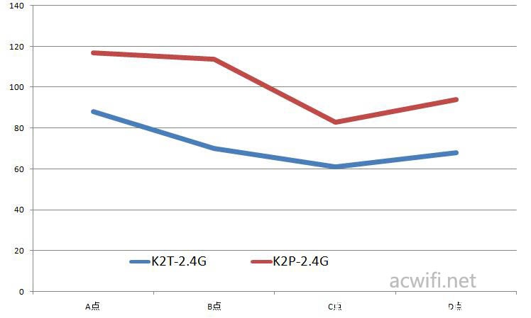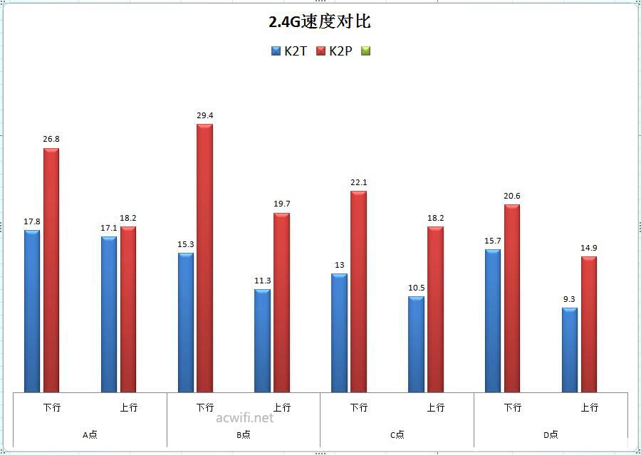 因为2.4G无线连接速率上的先天优势,使得银色版的K2P在四个位置都比K2T快;